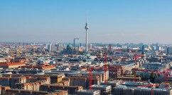 Berlin skyline with cranes at a building site near Potsdamer Platz in the foreground.
