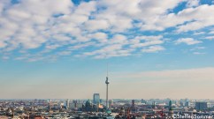 Berlin skyline with altocumulus clouds and the tv tower in the center.