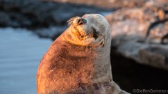 Galapagos fur seal (Arctocephalus galapagoensis) seemingly smiling. This is a "beachmaster" the dominant male of a herd.