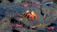 Sally Lightfoot crabs (Grapsus grapsus) fighting in a lava rock arena.