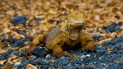 A land iguana ( Conolophus subcristatus) on black lava pebbles.