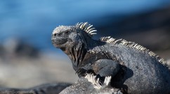 Marine iguana (Amblyrhynchus cristatus) watching sea lions.