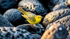 Yellow mangrove warbler (Setophaga petechia) on a lava pebble beach.