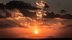The sun sets over a Greek islet at Crete's shore.