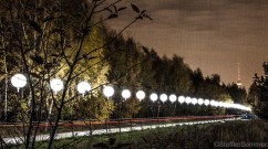 Along the former Berlin Wall - now the edge of a small birch forest - the illuminated balloons form the "25 years Fall of the Wall" installation.