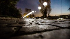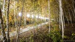 Illuminated balloons along the former Berlin Wall appear like a wisps amidst the birch trees.